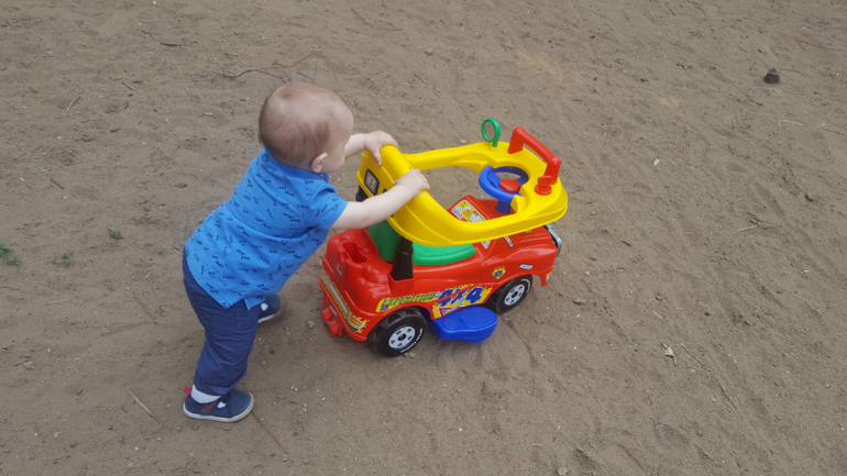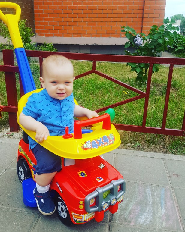 На день рождения мы подарили пупсику нашему машинку-толокар. Там можно за родительскую ручку возить, самому ходить и толкать, а потом уже сидеть рулить и отталкиваться ногами самому. Машинка ему безумно понравилась, мы ее даже выгуляли на улицу) Весь день с ней играл. Там кнопка на руле, он нажимает -> играет музыка -> Ромик приседает радостно (танцует). 😍
