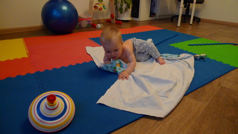 Вот так)))). А сейчас за опору во всю ходит, пытается сам, поэтому коврик пазл купили, очень удобно, а то на одеяли подскальзовался и падал.