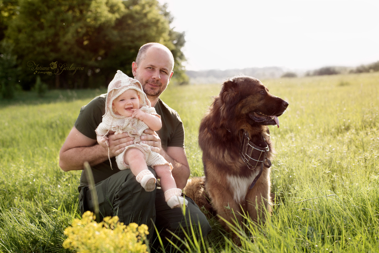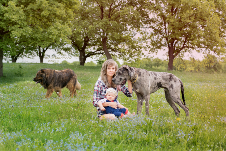 Считает, что наш дог - это детский коврик для ползания. Ну не дай бог он посмеет уйти. Орет.