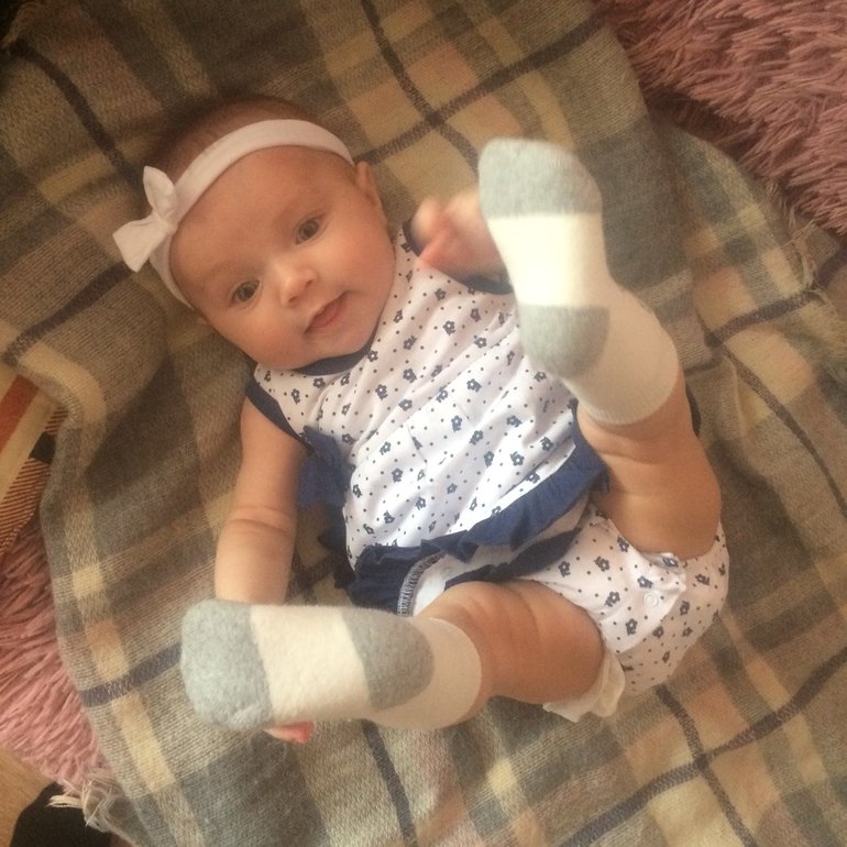 Дельке 4 месяца было 26 мая. Вес 6200 Рост 65! Забавная улыбчивая очаровашка. По прежнему на СВ.Деля очень любит свои кулачки, готова их съесть. Лежит хоть на спине, хоть на животе занятие одно -мусолить игрушки и руки. Не переворачивается, но думаю, вот - вот. Группируется, на бочке, но поворот пока не получается.Любит лежать в позе " ноги вверх" или попу вверх. Интересно, родилась с чёрными волосами, а сейчас светлые ( шатен).Ночью спит хорошо.