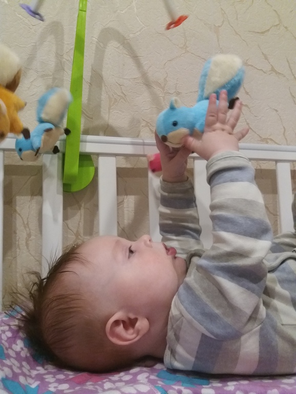 - Тянется и берет в руки игрушки, лежащие рядом с ним.