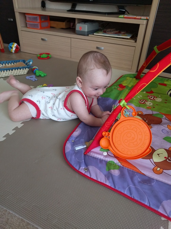 Блин, Женя вообще реактивный. Все вторые дети такие резвые???? Он встает на четвереньки и пытается ползти, правда ноги ползут, а руки ещё не поняли как надо ползти, и в итоге он падает лицом в пол 😁