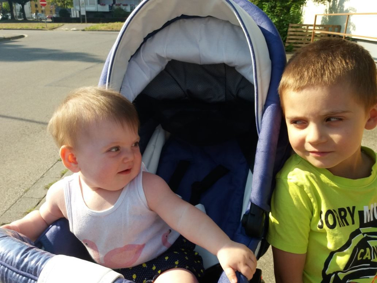 Мне очень понравилась фоточка где Поля в коляске, а Глеб рядышком!!!! У них у о боих такие взгляды))))