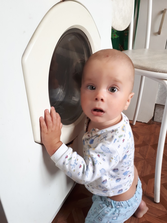 Перелезает через все паребрики и залезает на стол. Нужно быть ещё более внимательными,тк лезет везде и всюду. Перестал сидеть в стульчике для кормления:встаёт и пытается на стол залезть. Караул. Пристёгиваю,но всё равно пытается выбраться. Все дверки и ящики нужно открыть,в машинку стир.заглянуть.