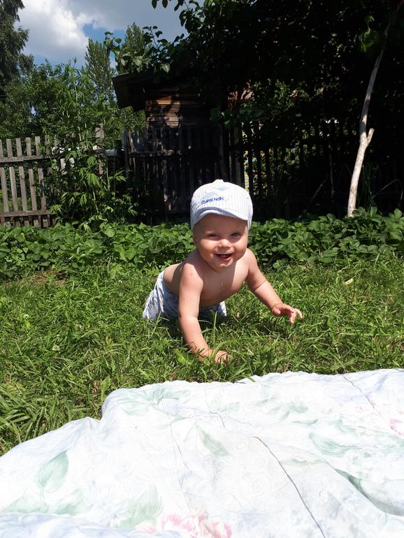 Из умелок почти всё так же:быстро ползаем,ходим вдоль лавочек и диванов,хлопаем в ладоши,машем пока-пока,очень много болтает (па-па,ма-ма,дяй-дяй,ро-ро,ра-ра). Вообще удивлена,что ребёнок с короткой уздечкой языка так чётко букву Р выговаривает.Может и не надо её подрезать. А из нового:научился подтягиваясь за одеяло залезать на кровать и слезать соответственно. Вынимает мелкие детальки из формочек.Купили вчера зайкину горку,так вчера же посмотрев как я кладу шарики и сам начал вставлять шарики и смотреть как они скатываются по горке.Научился мини башню строить из 2х мягких кубиков и потом рушить.
