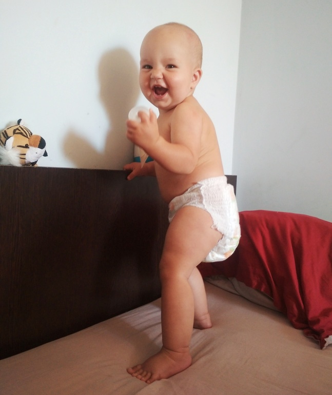 Встает на ноги часто. Держится одной рукой. Как-то раз пару секунд не держалась вообще ни за что. Я думала, что упадет, но нет.