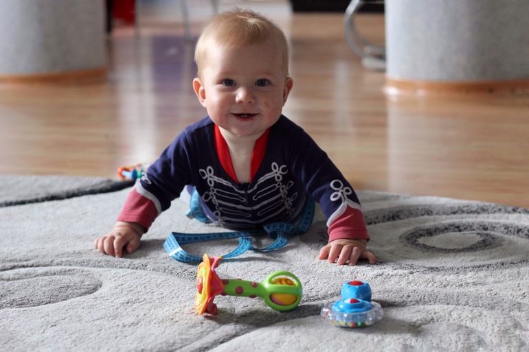 Обитает наш товарищ почти постоянно на полу. Ползает там чего-то себе на пузе. То под мебель залезет, то интересное что найдет и изучает всеми доступными способами.