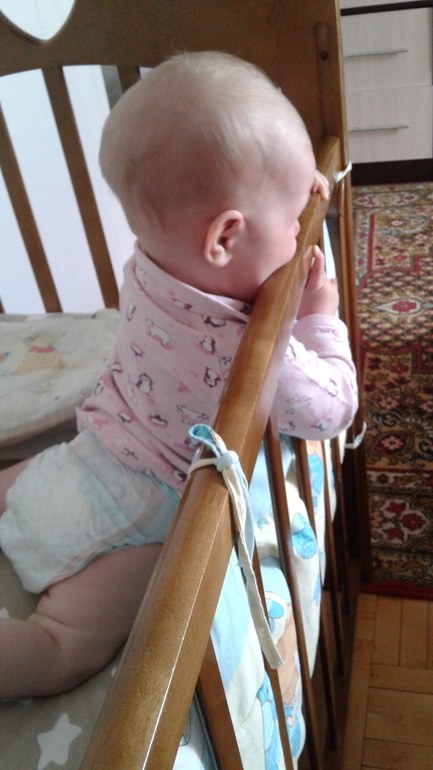 Пару дней назад встала на ножки полностью, тоже в кроватке.