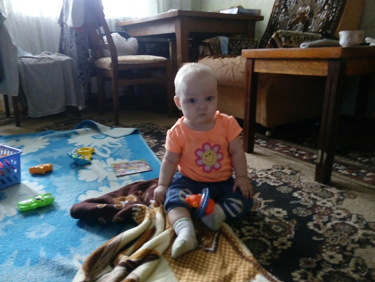 София весит уже 9 кг, зубы новые не появились, хотя очень старались. Малышка научилась хорошо и уверенно сидеть, полностью освоила ползание на четвереньках и активно встаёт у опоры, в роли которой обычно мама. Теперь усидеть на месте она почти не может, ей все время нужно куда нибудь ползти или "идти".