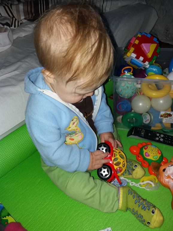 Игрушек у него уже гора, но в основном играет крышечками от детского питания)))