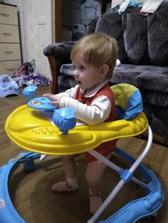 Отчёты по месяцамДевять месяцев исполнилось нашей кнопочке. Изменения всё менее заметны, но всё же они есть. Чему мы научились: петь, танцевать и вставать у ровной стенки. Теперь подъём не только возле дивана или стула, встаёт везде. А если кушать хочет, то подползает ко мне, держится за ноги и никуда не шагнешь, даже с целью приготовления еды. Вообще еда - это для нас всё. Если слышит кто-нибудь стукнул ложкой, держись, я иду помогать. В связи с такой любовью к еде, я быстренько стараюсь вводить всё новые и новые продукты. Освоили творог (добавляю фруктовое пюре для сладости), банан, желток, голубятину, в том числе потрошки (даже с печенкой осилила). Вообще мяско любит, даже немного курочки давала, жуёт своими двумя нижними. Часто улыбаюсь... сколько нужно человеку зубов, оказывается и двух хватает, главное хороший аппетит. Смесь всё так же поглощает. На завтрак и обед хочу попробовать компот давать. И кефир надо будет, но я пока не решила какой будем пить. Из нелюбимого остаются персик и абрикос.Зубов так же два торчат снизу, а верхние уже немного замучали, две недели текли сопли, это был небольшой кошмар т.к. перед каждым сном их нужно было отсасывать и капать. Сколько же было крика и слез пока злая мама выполнит эту процедуру. А без неё будет просыпаться и хлюпать носом, не лучший вариант. Но уже пару дней легче. Хотя зубы так и не застучали, но на десне уже так выглядывают милыми бугорками, скорее бы уже.Ещё у нас появился новый член семьи - это кися Нора. Кисе скоро будет 3 месяца. Конечно может и рано, но думаю если Катя будет старше, её тяжелее будет оттащить от маленького котенка, сейчас это реальнее. Так вот эти два чуда (Катя и Нора) получились практически одного возраста. Кормлю их одновременно и одним и тем же, играют они практически в одни и те же игры (зеркало, телевизор и пр.) И даже друг с другом играют. Как же это смешно выглядит. Правда кисе иногда достается за хвост, но стараюсь спасать вовремя. Катерина, мне кажется, теперь ещё и кисе подражает, на 4 кости становится, головой трётся, разве что не муркотит, но это может временно.Ещё к нам приехала бабушка на две недели. Один раз оставила Катю на неё, играла хорошо, а потом начала искать меня, теперь получила ребенка липучку, далеко не отпускает. Освоили хорошо букву Д (дя-дя-дя). Итак же хорошо машем пока, иногда даже двумя руками. Самый любимый момент - во время разговора по Вайберу, прям бежит чтобы помахать.Ходунки не особо признает, даже когда включили музыка на них. Минут на 5-10 максимум хватает. Но зато немного начала в них передвигаться стоя.Горшок всё так же наш помощник, теперь не только после еды сажаю, но и между. Бывает за день 2-3 штанов всего лишь мокрые, ну а на сон и прогулки конечно памперс.По графику: переход на два сна прошёл быстро, но никак не налажу укладывание на ночь пораньше, 10:30-11:30 для меня поздно, а Катерину раньше не уложить. Но думаю постепенно переведу. В еде у нас появился полдник. Теперь интервал после обеда составляет 2-3 часа.