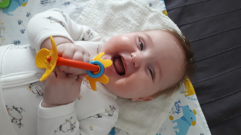✔ понемногу перекладывает игрушки из руки в руку, может даже что-то сам взять (но мне кажется это скорее случайность - цепкие пальчики случайно ловят то, что около них)
