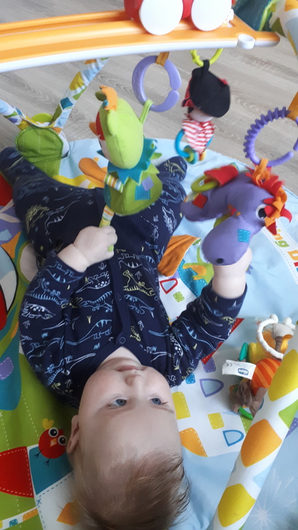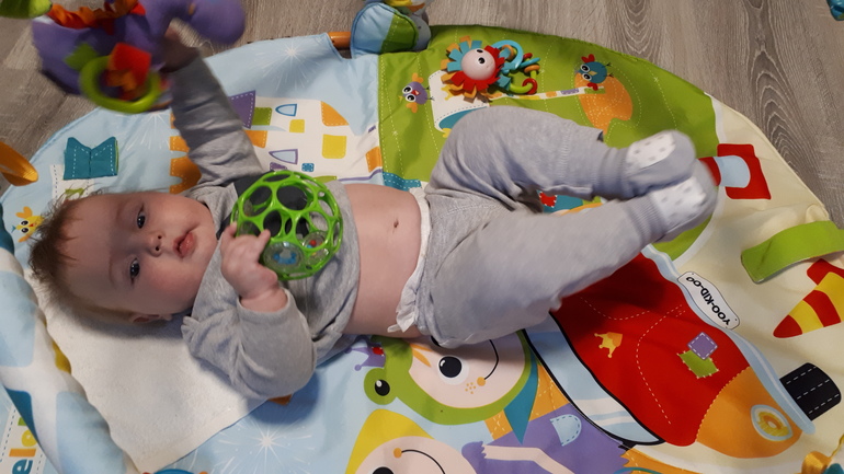затем понемногу начал тянуться к игрушкам (правда только к тем, что прямо перед глазами, на те, что сбоку просто смотрит)