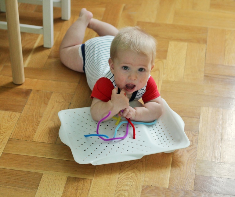 Делаю ему небольшие монтессори задания, которые занимают Аркашу, пока я готовлю. Например, вот такое с синельной проволокой и сушилкой для зелени. То ведерко с прицепленными прищепками оставлю. То коробку с дырочкой и спрятанными в нее цветными платочками подсуну.