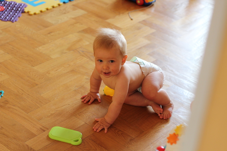 Ииии.... Аркаша прямо тут же решил и вставать начать. Силёнок в мышцах еще на это не хватало, но он упорно тренировался, пытаясь встать у любой мало-мальской опоры. И вот ровно через месяц, в 9 мес и несколько дней, сам начал вставать у опоры. Причем легких путей он не ищет. Начал с покрывала на родительской кровати. Так себе опора, прошу заметить. И тут же еще шагать в бок пытается. Постоянно теперь роняет на себя стулья в кухне, не знаем, как и спасаться(((.