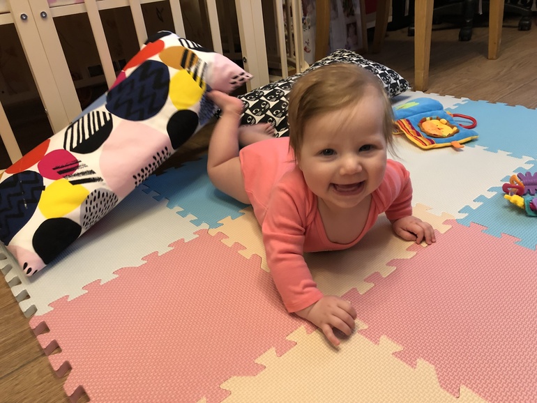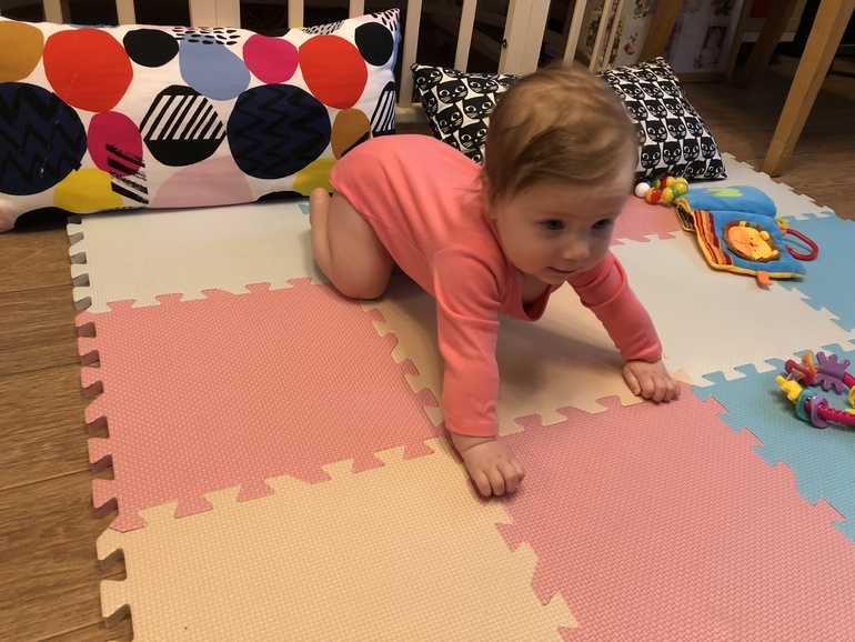 Ползает (но не в прямом понимании слова), передвигается на большие расстояния сама и вперед и назад, вокруг своей оси постоянно крутится, из положения на четвереньках пытается садиться, но чаще всего заваливается назад(( из-за этого теперь одну не оставишь ползать ни на секунду, страшно, что головушкой ударится (а у нас полы везде каменные) Купила ей шлем защитный, но он велик, прям очень)) Головка маленькая, у нас это семейное. Сейчас 41,5 см.