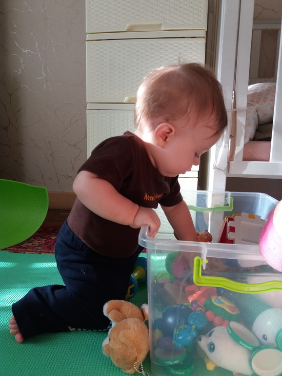 Из умелок: Ванюша научился махать "пока-пока", катать машинки, собирать игрушки в ящик. Любит гонять в догонялки с папой, бросать мячики и гоняться за ними)))