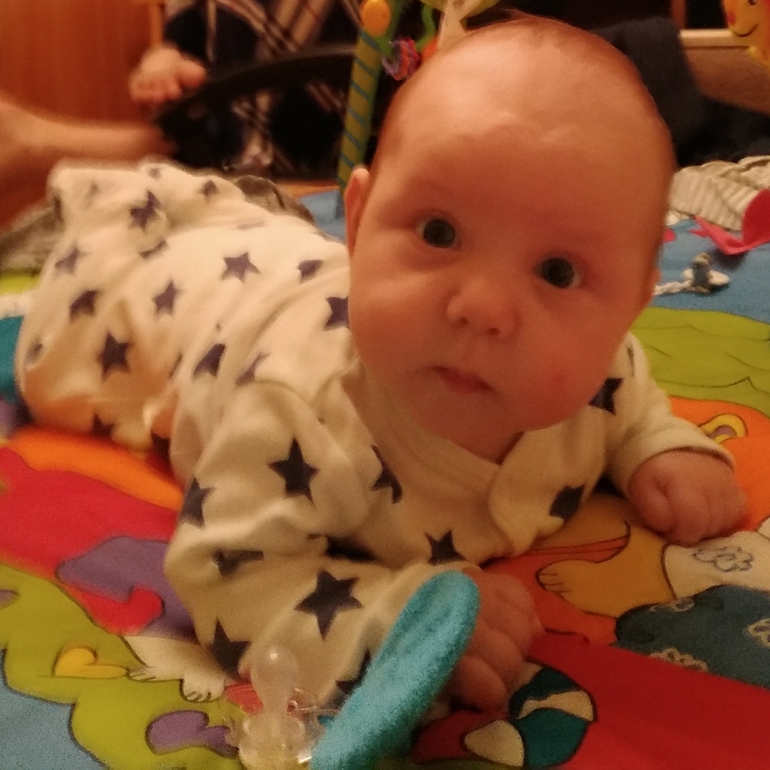 Ми уже отлично переворачивается и даже пытается ползти!Бо вообще не ползал. Держит голову, любит смотреть книжки, но в отличии от брата не любит ничего брать в руки, долго смотрит на предмет, пытается понять не опасен ли он, ручки обычно держит в замочком😸 Очень осторожен, пугается резких звуков, ну и плакса еще та😺 надеюсь это пройдет...