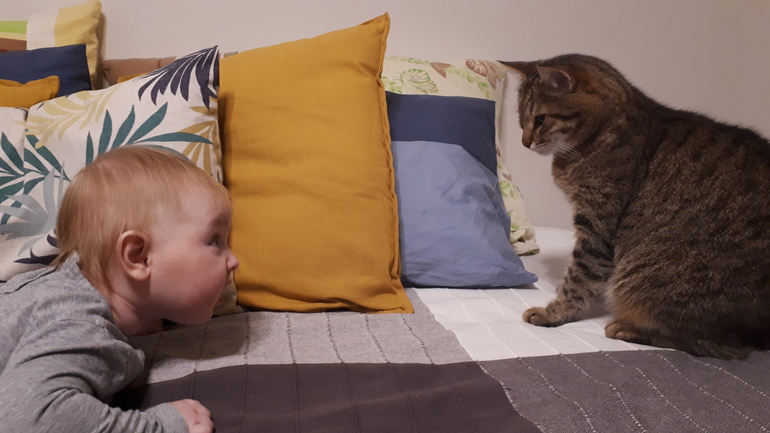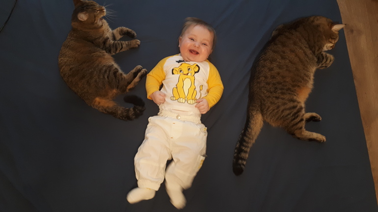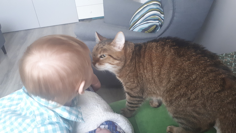 Лев все больше обращает внимание на котофеев: пытается их поймать, когда мимо проходят, погладить (хотя это тоже больше похоже на схватить), следит за ними не только взглядом, но и поворачивает голову 🐈🦁🐈 Чеша тоже стала проявлять интерес к новому обитателю нашего дома