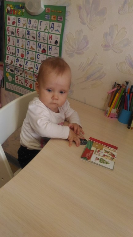 Играет в ку-ку, машет пока, показывает ежика и рыбку(губками так чпокает- сестра старшая научила), знает где лампочка и часики в каждой комнате.