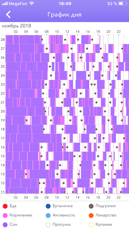 Фиксирую все в приложении, пытаюсь отследить закономерность🤓 но ее нет совсем (см график) 🙈 то спит по два часа то по 40 мин🤷🏻♀️ От времени просыпания и пляшем