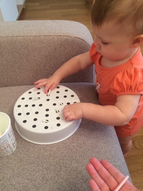 у нас была подобная игра в дуршлаг зубочистки проталкивал. сыну 2.3 года и иногда просит поиграть в нее.