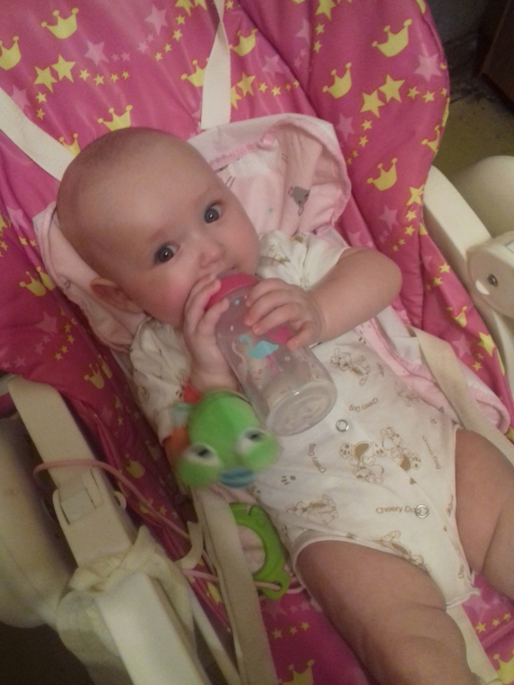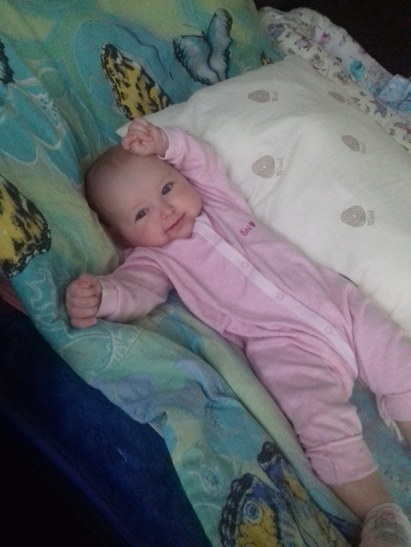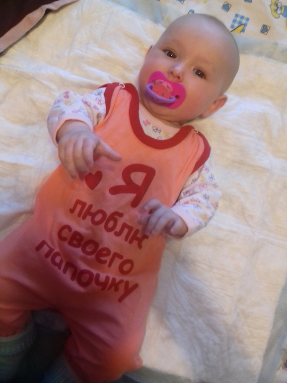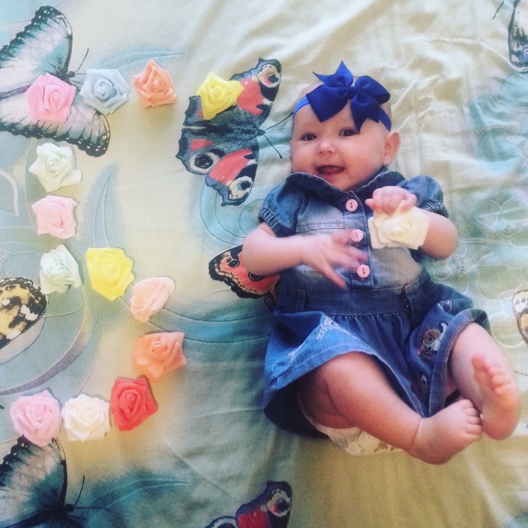 Умеем переворачиваться на животик,иногда обратно на спинку. Ползает по кровати на пузе,встаёт на коленочки.Любит болтать,появились новые звуки как АПУ!