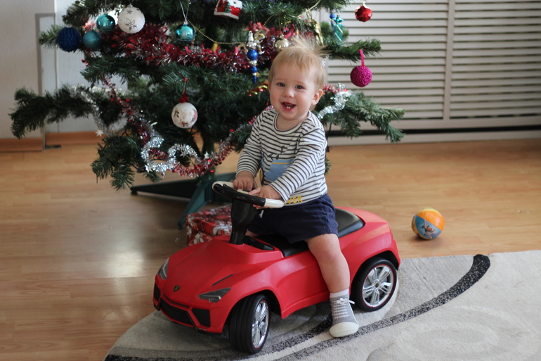 Ходит за одну руку много и довольно шустро, полностью отпуститься боится. Если сказать ему: "пойдем к ёлке/на кухню/чистить зубы" - то поведет в правильном направлении. Купили зимние сапожки, на улице тоже на ноги ставим, но в толстом комбезе стоит неохотно. За каталку ходит самостоятельно. У опоры иногда держит себя локтем: две руки свободные ему уже нужны.