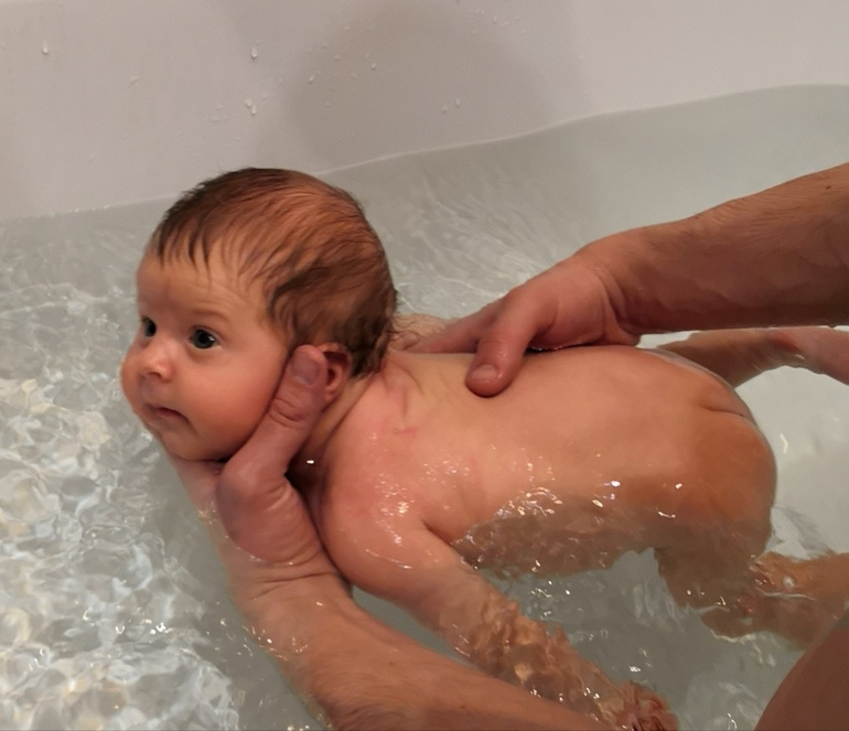 Купались первый месяц в маленькой ванночке с горкой, потом перешли в большую. На круг решились только один раз, ближе в двум месяцам, но Сёме не понравилось. Больше всего он любит плавать у нас на руках.