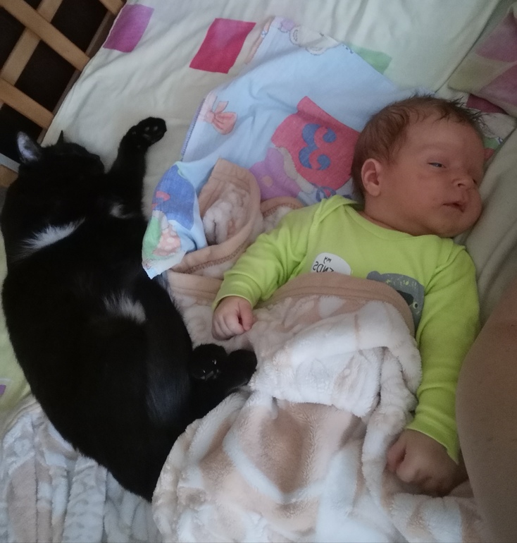Спит в кроватке, приставленной к нашей, вместе с котом. Первое время пытались запрещать Тимофею залезать в детскую кровать, но кот оказался очень упрямым.