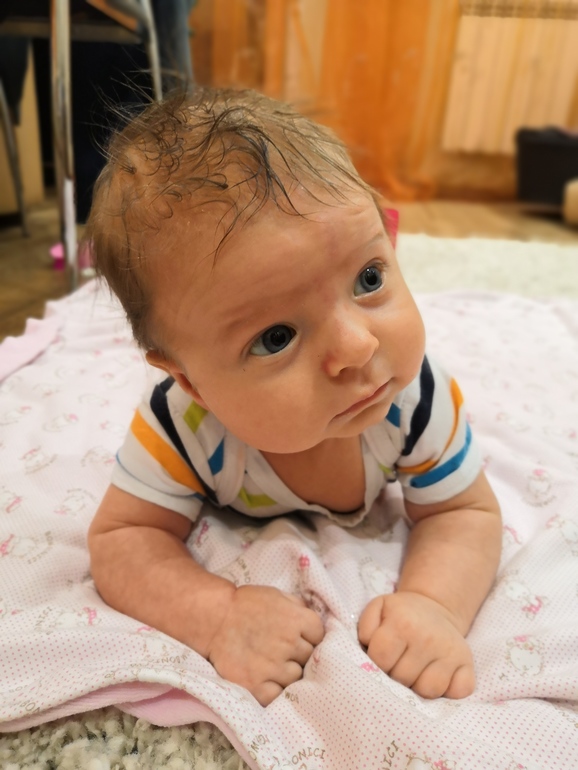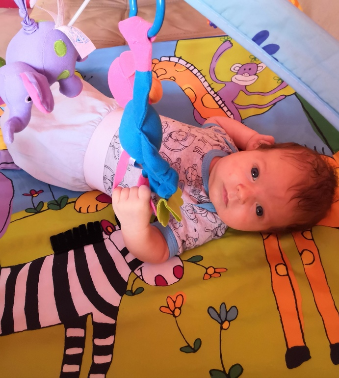 В месяц и 20 дней сынок хорошо следит за игрушками на дуге и в коврике. Начинает понемногу держать головку.