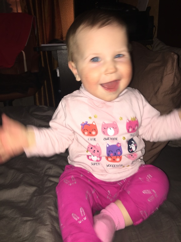 Научилась стоять без опоры около минуты, двух. Пытается сделать первые шаги без поддержки. Иногда выходит пройти самостоятельно 3-4 маленьких шага от папы до меня. Но очень страшно🙈