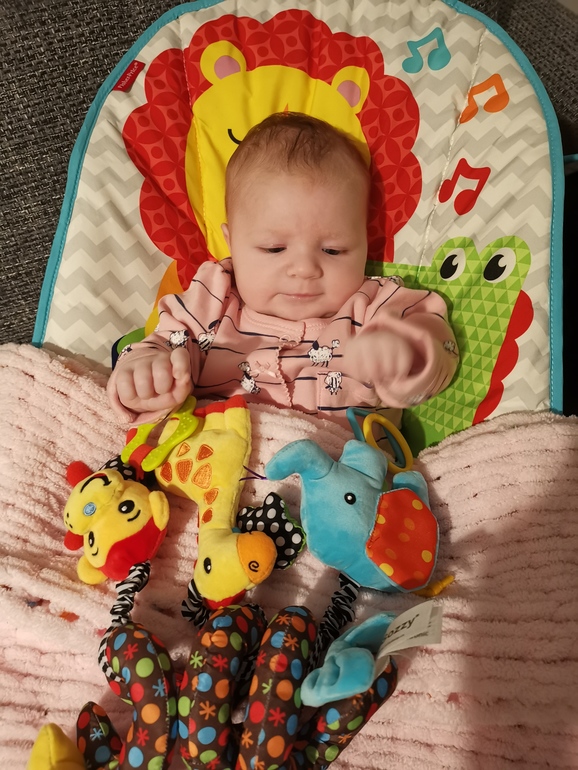 Очень хорошо держит голову, поднимается на ручках, когда лежит на животике, переворачивается на спинку, и просто оооооочень сильно любит играть в игрушки. Каких у нас только нет!