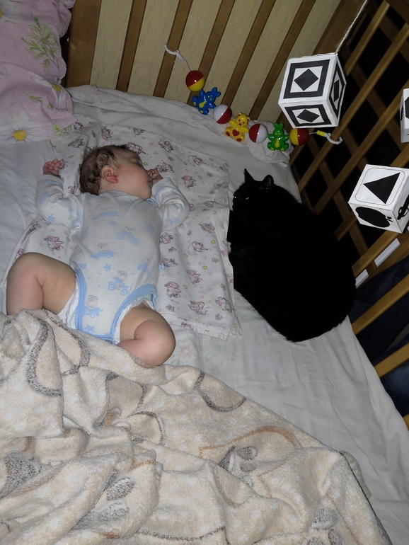 У меня два кота, вместо старшего ребенка, оба получа люлей, если прилягут у сына в кроватке, поэтому кошка в районе моего животая, а кот - в ногах либо у меня, либо у мужа, выталкиваем его по очереди друг к другу 😬