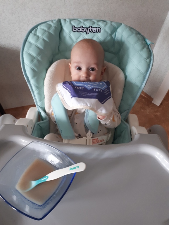 * начал есть прикорм и пить воду (любит рис и гречку, морщится от кабачка и брокколи, сам хватает из моих рук ложку и тянет в рот. Когда не хочет есть - отпихивает ложку изо всех сил. В целом прикорма ест пока мало)