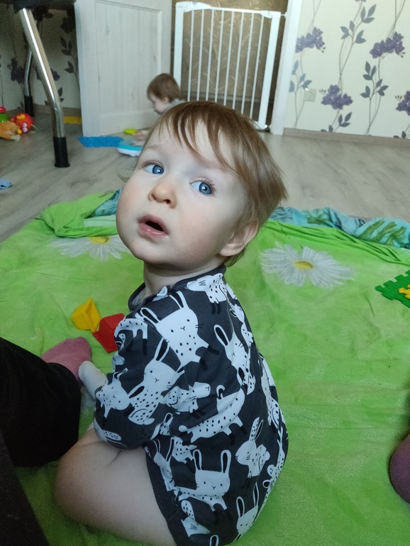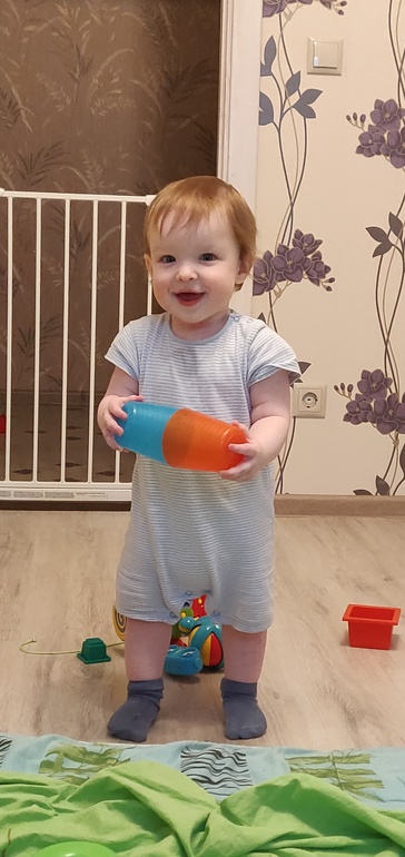 Очень самостоятельный ребенок, один может играть хоть весь день, только корми вовремя. Ко мне подходит редко, раз-два за день, пообнимается и убегает. На руках сидеть не любит, пихается, требует спустить на пол. Постоянно весь в синяках и ссадинах - боевой :) Все отнимает у сестры, она расстраивается...
