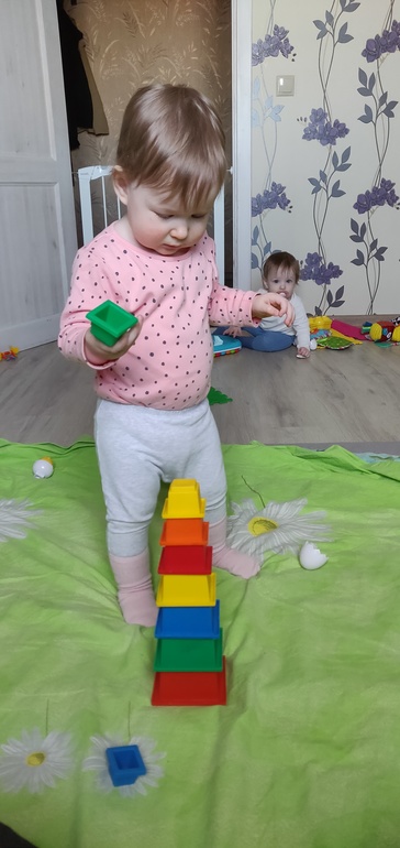 Любит изучать закон всемирного тяготения - кладет игрушки на стол и потом их оттуда сбрасывает. Если предмет круглый, то нравится смотреть как катается. Умеет вставлять друг в друга квадратные формочки разных размеров :)