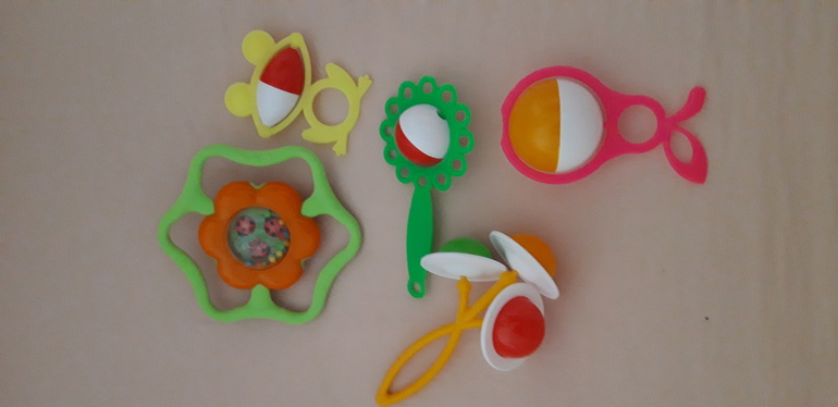 Погремушки показываем,смотрит их,я ему сую в руку самую легкую,он задерживает ее,может трепануть,но пока это все не осознанно,просто машет рукой,в которую мама засунула погремуху☺.