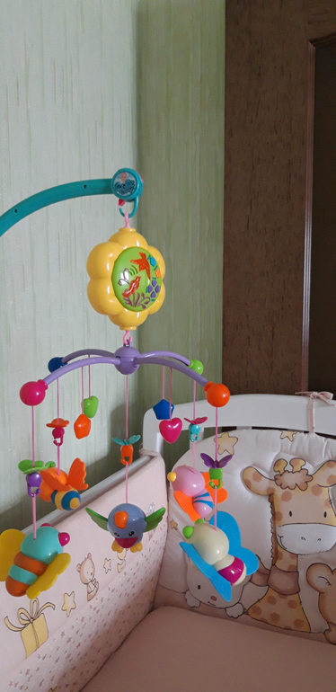Второе-мобиль, наконец-то и он заинтересовал.До этого повесили, когда шёл первый месяц,но буквально 2 минуты и он стал не интересен.Убрали,думали,что вообще не понадобится больше.Решила повторить попытку- повесила снова, когда малыш стал залипать на узоры.И вуаля,малыш с интересом рассматривал кружащие над ним игрушки и гукал с ними,делая при этом голосок нежным таким☺.Сейчас мобиль это палочка-выручалочка(правда не на очень долго,но хоть так).Малыш смотрит на него,дрыгает ногами и руками,улыбается,гукает. Это время небольшой свободы для мамы(чтобы поделать домашние дела).Я даже успела как-то помыть пол в ванной и прихожей💪.