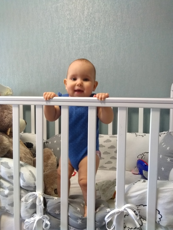 Хорошо ползает на четвереньках, по всей квартире, можно даже играть в догонялки😀.