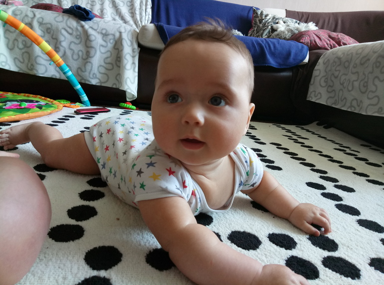 Степаха - тяжелый, ленивый человечище. Сделали массаж, шея была зажата ощутимо. Два дня назад соизволил продемонстрировать, что умеет переворачиваться, но как-то ему это не принципиально. Лежит, поет песни, пинается. Спать? Ок. Поесть? Вообще шикарно. Тюфяк и обаяшка.