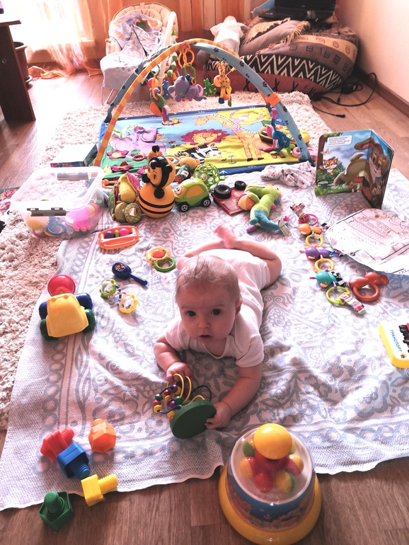 У нас книжка с которой можно купаться, а ещё она с пищалкой. С ней не купаемся, но на суше заходит на ура. Если у мамы хорошая фантазия , а ребенок любит сказки, напалечники в виде зверят. В ванну резиновые утки, или другие животные, у нас ещё заводящийся бегемот. Также есть фигурки которые липнут к ванне при намокании, но я пока таких не нашла в магазинах. Игрушки типа подвесных с шуршалками, пластиковыми деталями разными тканями. Ещё игрушки на батарейках с музыкой и светом (с кнопками чтобы ребенок со временем понял связь нажатия и проигрывания музыки). Игровой коврик в моем случае высвобождает время