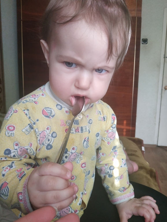 Пробовали мороженное. Растаявшее. На кончике ложки, просто так, ради "посмотреть реакцию". Посмотрели на свою голову 🤦 Дочь потянулась ещё, ей естественно не дали, начала орать.