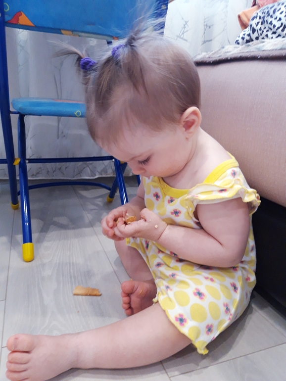 Кушаем всё, кашки, овощи, мясо, творожок, биолакт, рыбу ввели, желток. Варю пока отдельно, но если сами садимся есть, то ей обязательно надо что-то давать, даю по чуть-чуть.
