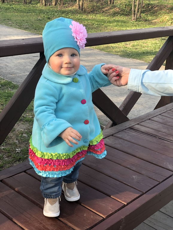 В годик и 2 недели начала ходить сама, а то все по пару шажочков было и ползком дальше, теперь ходит преград ей нет))) Везде лезет, все раскидывает, наводит свои порядки))) Обожает вещи, коробку с вещами ей можно поставить и она час будет сидеть копошится в них. Знает, где стоит корзина с её вещами на стирку, идет тащит и выгребает, перетряхивает оттуда все вещи, что-то пытается на себя примерить, прикладывает то к голове, то на шею намотает, смешная)))