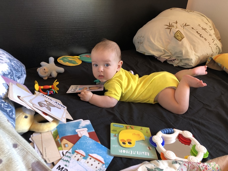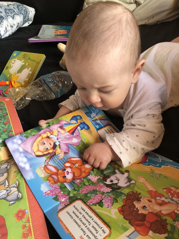 Очень любит читать! И жевать прочитанное конечно же, для закрепления материала видимо)) вообще в рот тянет все, до чего дотягивается. Пытается присаживаться, но просто вертикально из положения лёжа, читала, что так он не сядет, так что ждемс.