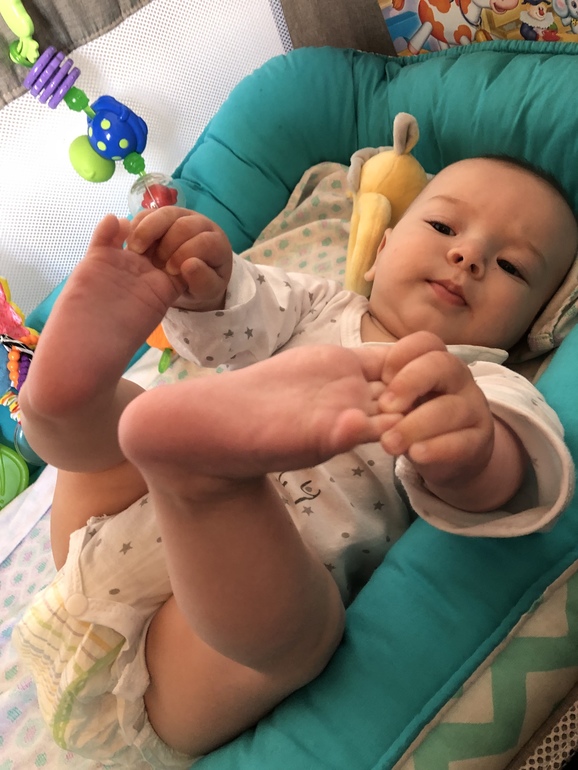 Любит лежа на спине держать себя за ступни и пытается засунуть их в рот