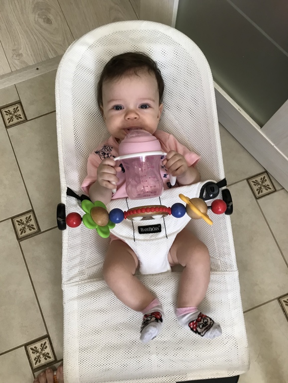 Вчера когда готовила на кухне, решила включить телек для фона, забыв отвернуть шезлонг с Василисой. Привлекло то, мне показалось что она посмеялась в голос. А потом еще, вроде не показалось, но больше она этого не делает.