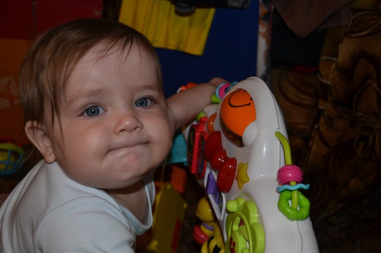 Неверное, только ленивый не заметит, что Алиса постоянно с распущенными волосами. Ну вот не любит она ни головные уборы без завязки, ни резинки и заколки тем более. Особенно остро эта проблема проявилась ближе к годику. Даже на день рождения у меня не вышло надеть на нее коронку. А при любой попытке надеть резиночку, она ее стягивает и если пытаешься ее держать за руку и объяснять, это обязательно крики. Как не удивительно, но Алиса не проявляет особой любви к мультикам. Когда очень нужно что-то сделать и я пытаюсь отвлечь ее хотя бы теми, которые увлекают ее более или менее, то хватает ее максимум на пять минут. Зато опять же, когда спрашиваешь, "Алиса будет смотреть мультики" или "где мультики", Лисёнок смотрит в сторону телевизора. Опять же, с ориентацией и понятиями "что", "где" всё в порядке. На детской площадке она внимательно следит за ребятами постарше, которые, например, пинают мяч на футбольном поле, и пытается подбежать к детям помладше, которые качаются на качелях и т.д. Не так давно у Алисы началась новая мания закидывать различные предметы в аквариум. Это доставляет ей особое удовольствие. Из того, что я могу вспомнить только сейчас, там побывали ручка от ручной мясорубки, ее музыкальный детский телефон и новая бабушкина помада. Знает очень многих животных. Иногда, конечно, их еще путает, но с каждым разом справляется все лучше и лучше. Учим мы их всеми путями: и случайно встретив нее улице, и по карточкам, и особенно увлекательно выходит озвучивать зверят на мпециальном музыкальном коврике. Говорить "гав", "мяу" и т.д. еще не получается, но при упоминании этих звуков Алиса ищет собаку и кошку, соответсвенно. Если ее спросить где то-то и то-то, то она смотрит в сторону предмета обсуждения (например, кота). Если же его нет в радиусе обозрения, то она обязательно отправится на его поиски. Но иногда все зависит от настроения. Алиса очень ручной ребенок. Несмотря на свой своенравный характер, очень привязана ко мне. Старается пить из обычной кружки, если та попадает к ней в руки. Получается не плохо, но давать ей стакан с содержимым я пока не рискую. Мы активно учимся пить из спортивной детской бутылочки, а во время написания этого отчета, в один из дней, Алиса научилась пить сок из трубочки как абсолютно взрослый человек, если не считая того, что периодически она давит на коробку тетропака и частично провилавает его содержимое на себя. В целом много лепечет, говорит "дай", а вот "мама" перестала говорить с месяцев девяти, тогда это было прям слово-фаворит. Любит щелкать выключатели, играть с феном, утюжком для волос и раличными проводами, к плошкам-поварешкам уже не проявляет сильного интереса, но любит играть с кострюлями, тазиками и ведрами. Периодически пытается карабкаться на диван, но пока что терпит фиаско, более успешно удается оделевать тротуары и небольшие приступки. Очень любит кататься с детских горок. Во время уличных игр уже более осознанно походит к вопросу того, что можно, а что нельзя тянуть в рот. Если месяц назад камень из песочницы Алисе хотелось попробовать на вкус, то теперь она только их рассматривает и вертит. А с тюбиками все посложнее, особенно с теми, с которых можно легко сгрызть этикетки. Машет "привет" при встрече и если видит сборы у выхода, то тоже будет махать ручкой вслед, бежит к дверям, когда кто-то приходит и обнимае