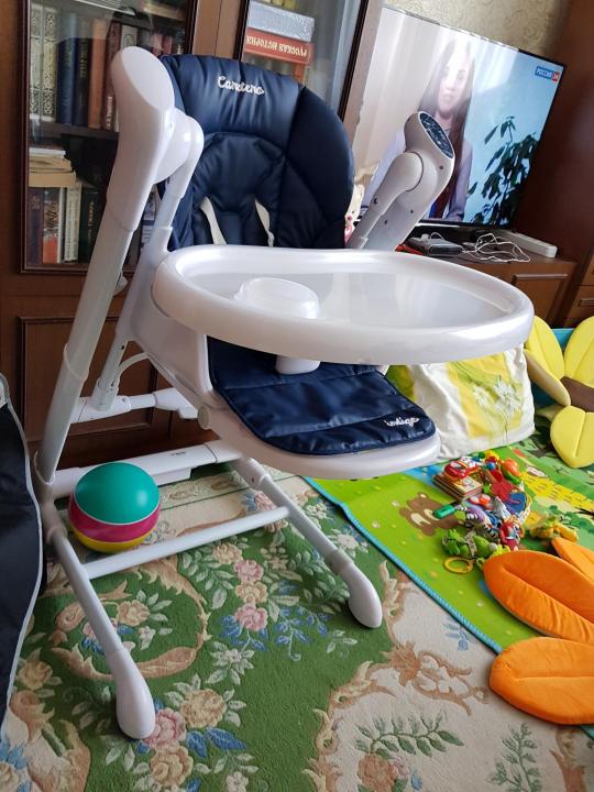 модель Caretero INDIGO 2в1 , на первом фото качель, используем самого рождения, очень удобно, спинка раскладывается до горизонтального положения, вообще положений несколько, можно выбрать оптимальный вариант для малыша. Как подрастем перейдем к стульчику, поднос двойной схемный, материал не маркий